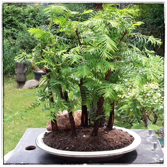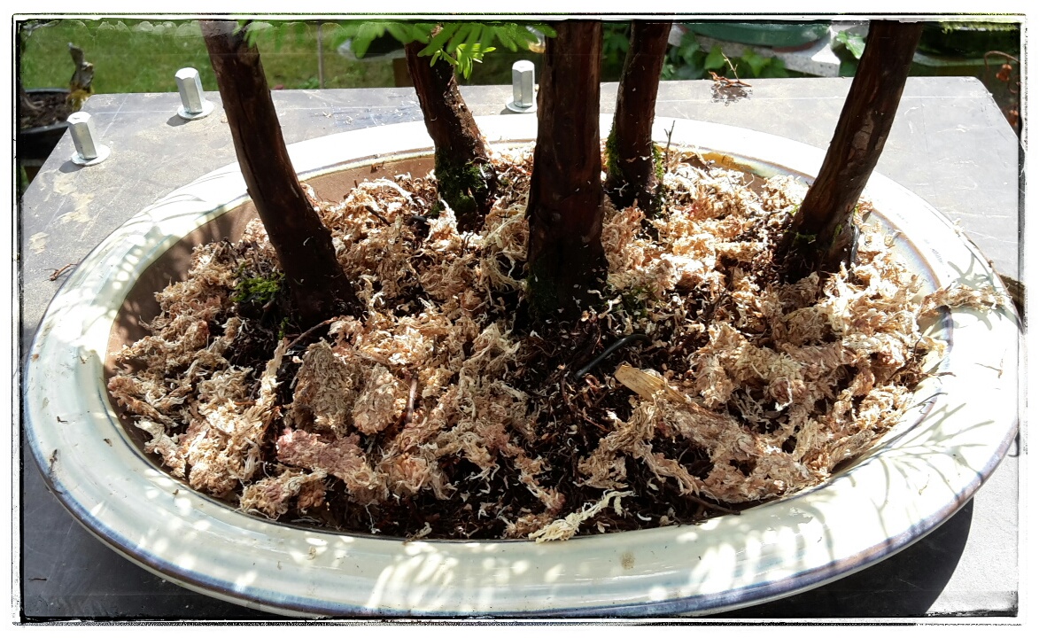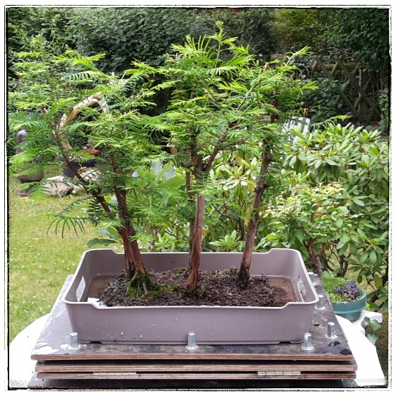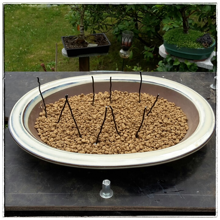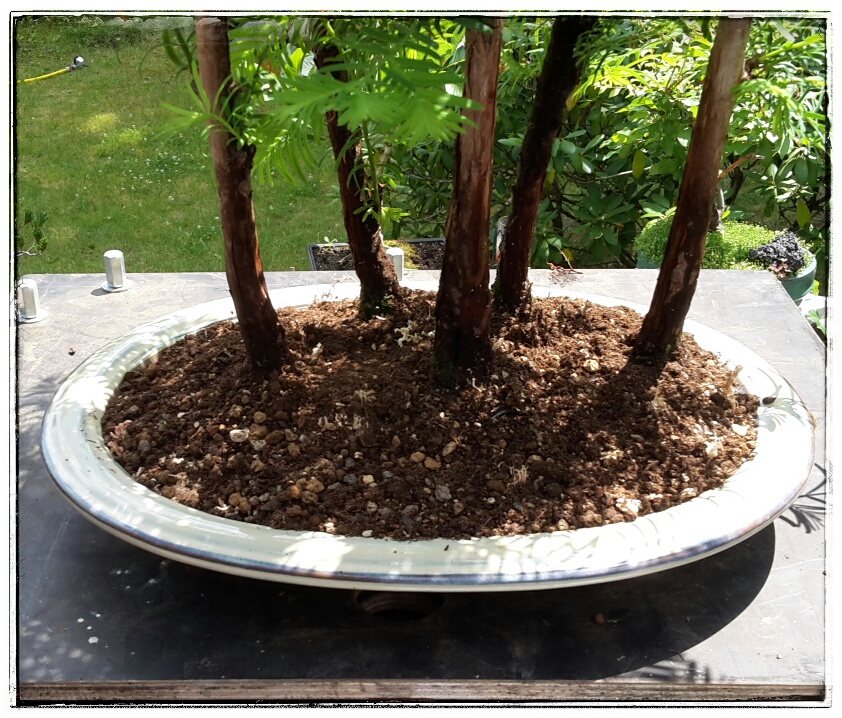 Also legte ich die Baumgruppe (mit dem kompakten und intakten Wurzelbereich) vorerst nur auf die neue Schale und wartete auf kühlere Tage.