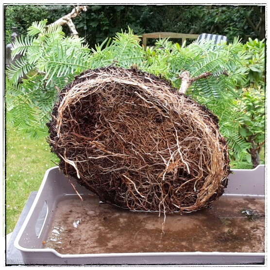 Nun waren die Temperaturen an diesem Tag gerade supoptimal (35 Grad im Schatten), um hier gleich final tätig zu werden. Aber was ich dabei sah war eben auch, dass es eh Zeit gewesen wäre hier Hand anzulegen. Der Wurzelballen war nicht nur gut durchwurzelt, sondern es bildeten sich bereits sogenannte Ringwurzeln, die immer den Bonsaianer zum Tun auffordern.